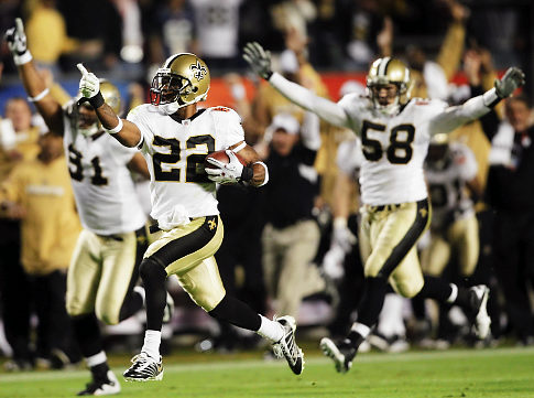 New Orleans Saints cornerback Tracy Porter (22) reacts as he returns an interception 74 yards for a touchdown against the Indianapolis Colts during the second half of the NFL Super Bowl XLIV football game in Miami, Sunday, Feb. 7, 2010. (AP Photo/Mike Groll) Original Filename: Super_Bowl_Football_SB417.jpg
