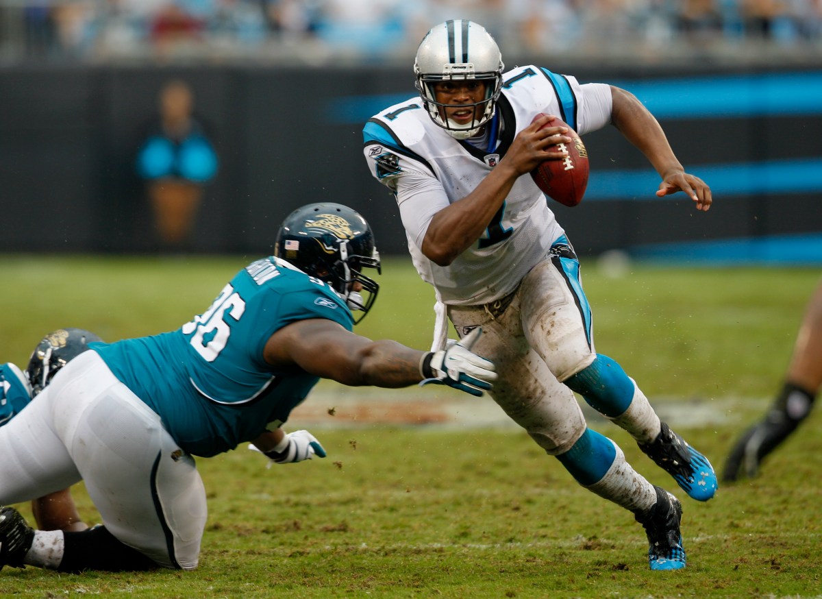 Carolina Panthers’ Cam Newton (1) scrambles as Jacksonville Jaguars’ Terrance Knighton (96) pursues during the fourth quarter of the Panthers’ 16-10 win in an NFL football game in Charlotte, N.C., Sunday, Sept. 25, 2011. (AP Photo/Chuck Burton)