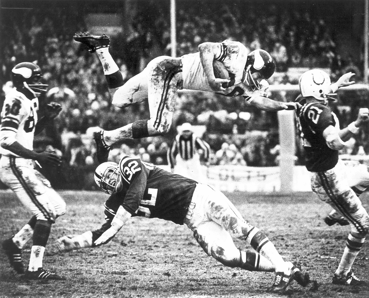 A Minnesota Viking player dives of Baltimore Colts Mike Curtis during game at Memorial Stadium on September 19, 1971. (Paul Hutchins/Baltimore Sun)
