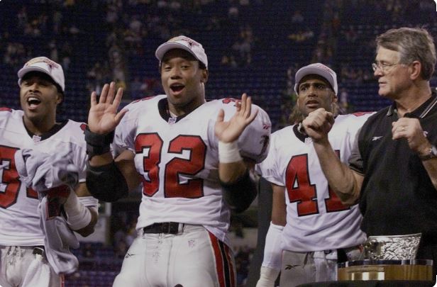 First you had Chris Chandler, a career journeyman who played for 5 teams before landing in Atlanta. Outside linebacker Cornelius Bennett, who had been a pro bowl player and perennial Super Bowl runner up with the Buffalo Bills, found new life in Atlanta once his tenure ended with the Bills. Wide receivers Tony Martin (66 rec. 1,181 yds 6 tds) and Terrence Mathis (64 rec. 1,136 yds 11 tds) were castoffs of the Chargers and Jets respectively. Martin was the deep threat that scored the deciding touchdown in the Charger’s 94 AFC Championship win over Pittsburgh. Mathis was a serviceable 3rd receiver for the Jets who finally became a starter in Atlanta.