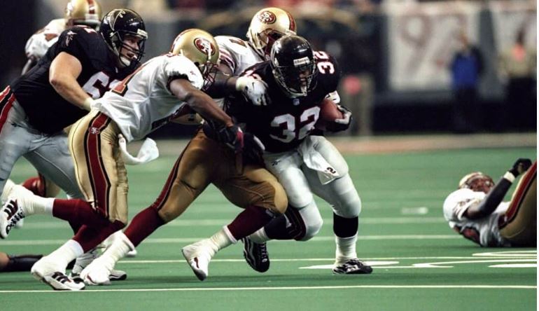 First you had Chris Chandler, a career journeyman who played for 5 teams before landing in Atlanta. Outside linebacker Cornelius Bennett, who had been a pro bowl player and perennial Super Bowl runner up with the Buffalo Bills, found new life in Atlanta once his tenure ended with the Bills. Wide receivers Tony Martin (66 rec. 1,181 yds 6 tds) and Terrence Mathis (64 rec. 1,136 yds 11 tds) were castoffs of the Chargers and Jets respectively. Martin was the deep threat that scored the deciding touchdown in the Charger’s 94 AFC Championship win over Pittsburgh. Mathis was a serviceable 3rd receiver for the Jets who finally became a starter in Atlanta.