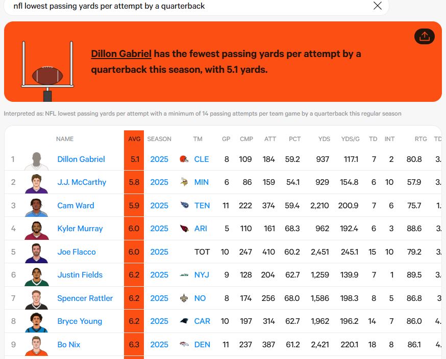 Yes 5.9 yards per attempt would have been 30th if he had enough pass attempts. He’d be with JJ McCarthy who is getting laughed at in Minnesota.