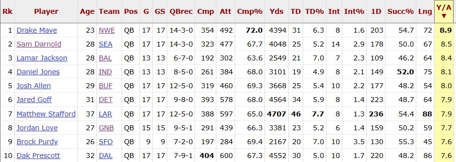 The truth of the matter is that gaudy 8.48 yards per attempt is 2nd in the league to Drake Maye. If you’re new here I wrote out on Dec 9th “The Lie Behind Quarterback Passer Rating & Several Useless Statistics” where I told you yards per attempt is the statistic that equates to team success not passer rating… well #1 and #2 in yards per attempt are facing off in LX or 1st vs 11th in passer rating … yet I digress