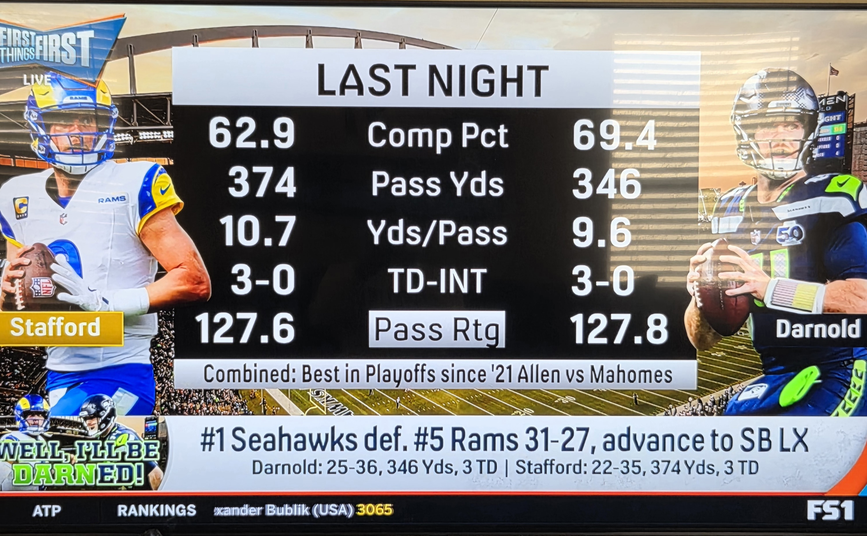 The truth of the matter is that gaudy 8.48 yards per attempt is 2nd in the league to Drake Maye. If you’re new here I wrote out on Dec 9th “The Lie Behind Quarterback Passer Rating & Several Useless Statistics” where I told you yards per attempt is the statistic that equates to team success not passer rating… well #1 and #2 in yards per attempt are facing off in LX or 1st vs 11th in passer rating … yet I digress