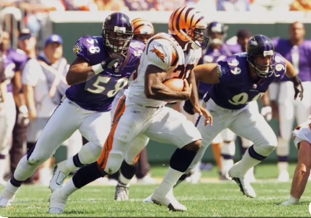 Fellow Linebackers Jamie Sharper (72 tackles /5 forced fumbles) and Peter Boulware clogged passing lanes, stuffed the run, and blitzed effectively. Boulware had 7 sacks as a Nickle rushing end. DE Rob Burnett led the team with (10.5 sacks) was a holdover from the Cleveland Browns days. He and fellow DE Michael McCrary were steady rushers that couldn’t be moved off the ball.