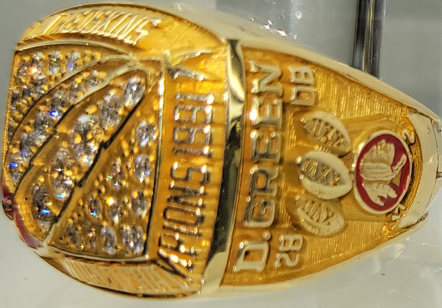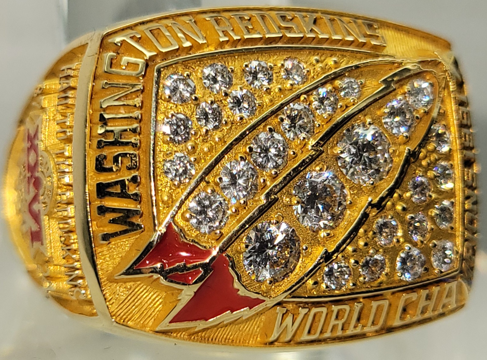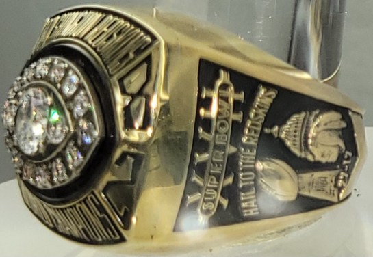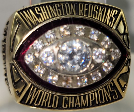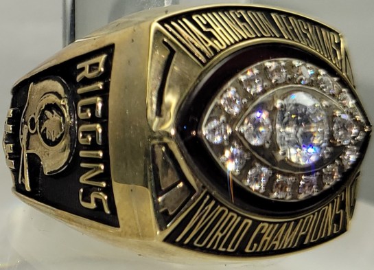 Hail to the Redskins: Really? David Woodley can’t complete ANY passes in the second half of Super Bowl XVII for Miami?? None?? Ok he completed two in the second half, 1 to his team and an interception to Redskins S (present Green Bay Packers President & CEO) Mark Murphy and wasted a decent effort by the “Killer B’s” defense. However the Super Bowl win by Washington was a throwback to old fashioned grind it out football with Riggins for 4, Riggins for 3, Riggins for 5, and wearing down the defense. However, when I see this ring it takes me back to two weeks prior.