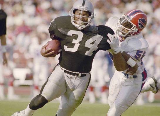 Bo powering past perennial all pro Cornelius Bennett of Buffalo.