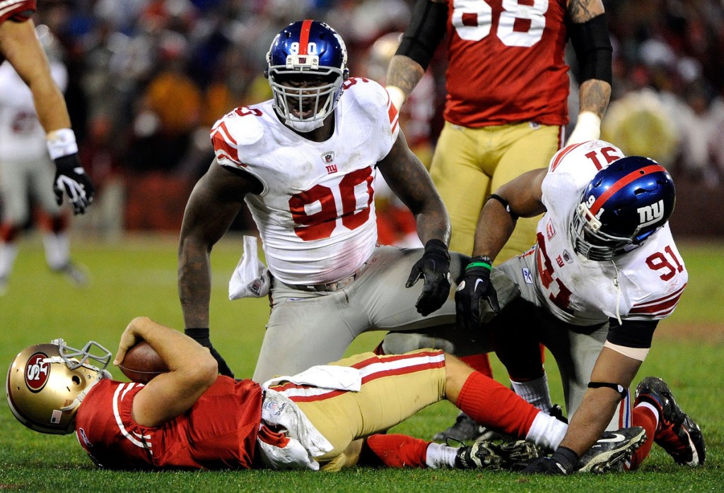 Pierre Paul emerging from a sack of Alex Smith in the NFC Championship Game