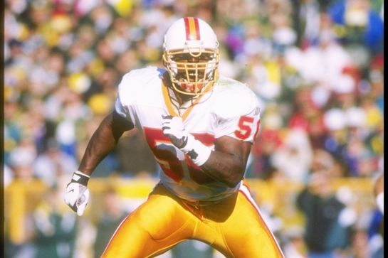 Nickerson became the centerpiece of Defensive Coordinator Floyd Peters’ 4-3 at Middle Linebacker and a terror was set loose. He became a sideline to sideline tracker and hit everything in sight. In ’93 he led the NFL in tackles with a team record 214 while making his 1st Pro Bowl and voted 1st team All Pro. It was only the 4th time a Tampa Bay defender was voted to the Pro Bowl in Hawai’i and the 2nd all pro selection since the team’s inception in 1976.
