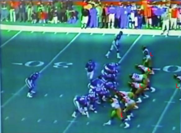 George Bethune #57, takes over as the ‘nose backer with Brett Faryniarz #51 rushing from the weak-side along with Greene #91 on the strong side. Since Strickland’s first step is forward, Roberts #66 has to honor his charge and not help out LT Jumbo Elliot. He has no one to block!! Greene and Faryniarz’s rush is so strong Simms has to get rid of the ball and Jerry Gray, zoning away from RB Dave Meggett, tips the pass that Michael Stewart intercepts. You also notice that Meggett’s “scat” route was to his right and away from the DE that dropped in the weak flat. Shurmur fielded ONE DL and didn’t rush him!! In a nickel defense?? Think about that for a second…