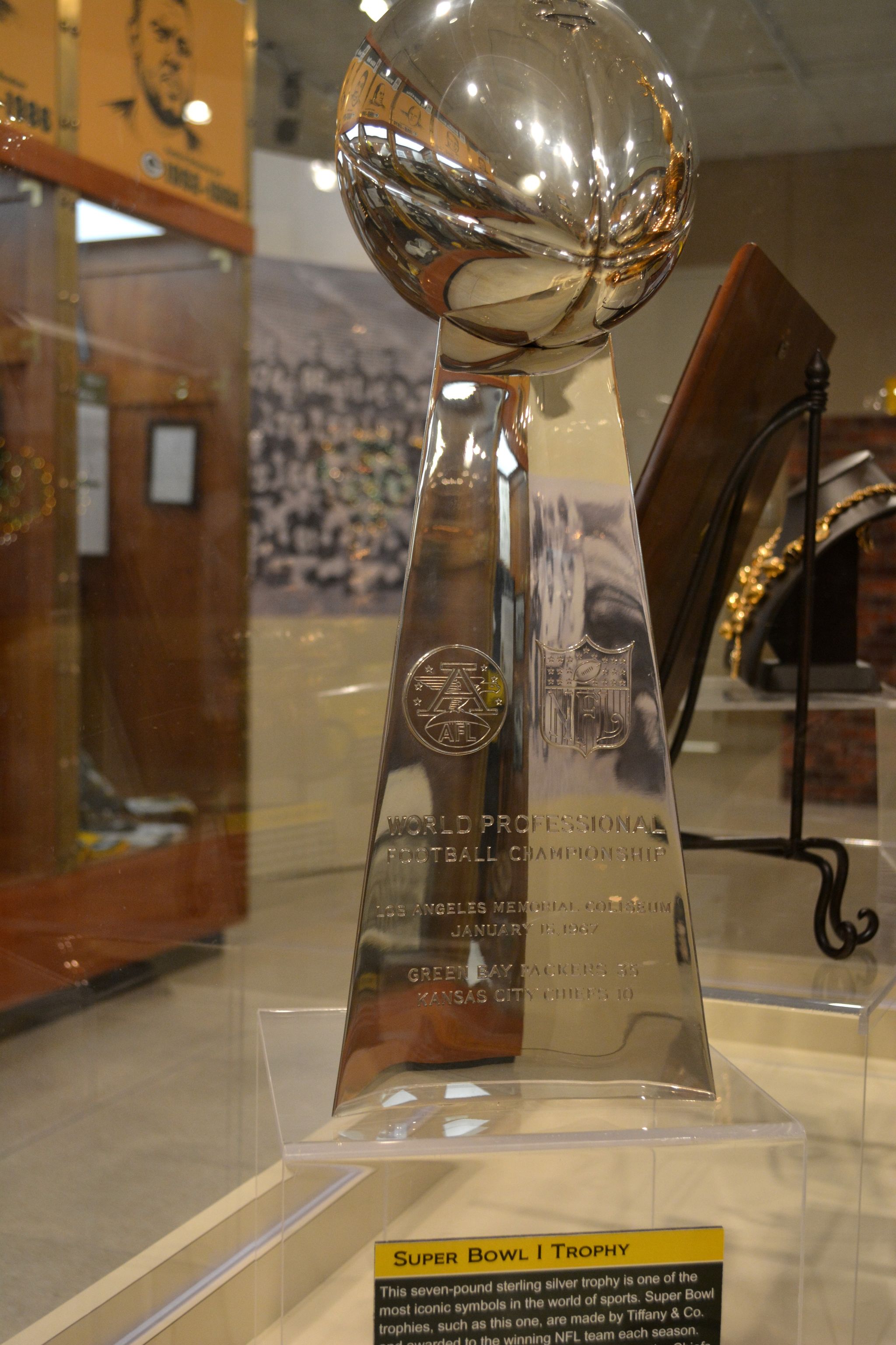Super Bowl I Trophy sits in the Green Bay Packer Hall of Fame.
