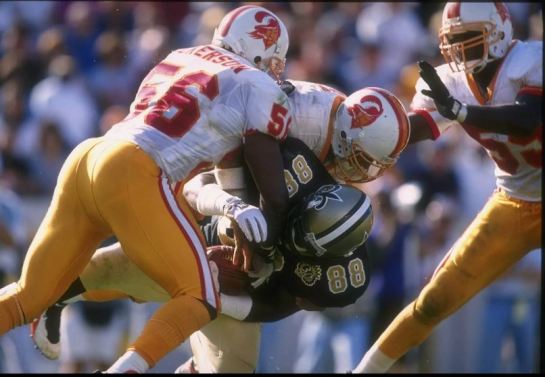 Well… Nickerson became the centerpiece of Defensive Coordinator Floyd Peters’ 4-3 at Middle Linebacker and a terror was set loose. He became a sideline-to-sideline tracker and hit everything in sight. In ’93 he led the NFL in tackles with a leauge record 214 while making his 1st Pro Bowl and voted 1st team All Pro. It was only the 4th time a Tampa Bay defender was voted to the Pro Bowl in Hawai’i and the 2nd All Pro selection since the team’s inception in 1976.